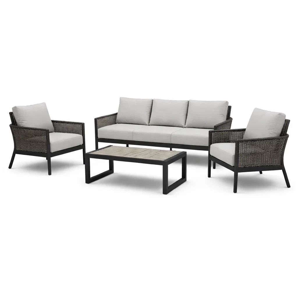 Set di divani con poltrone e tavolino in alluminio e tessuto grigio