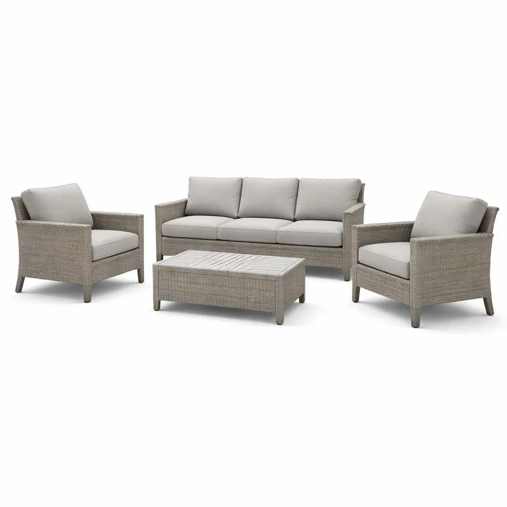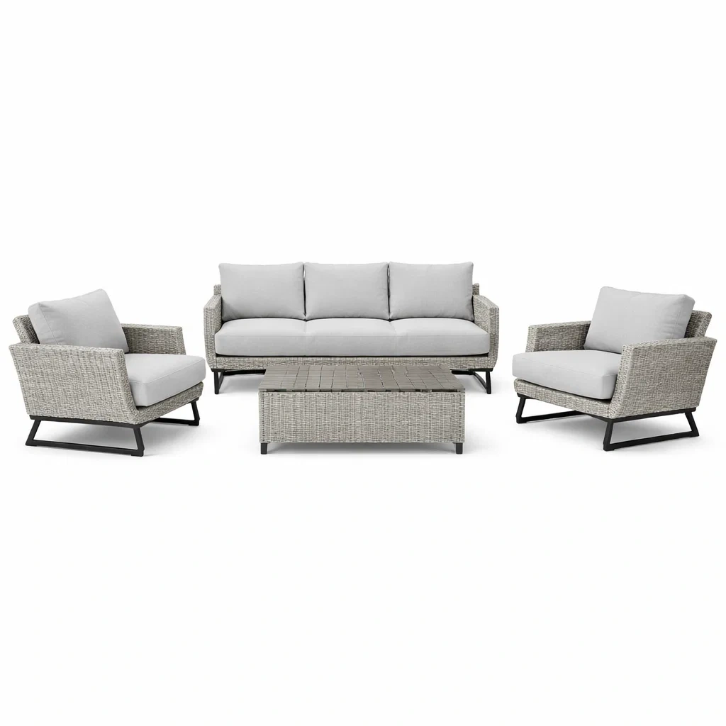 Set di divani in rattan sintetico grigio con poltrone e tavolino