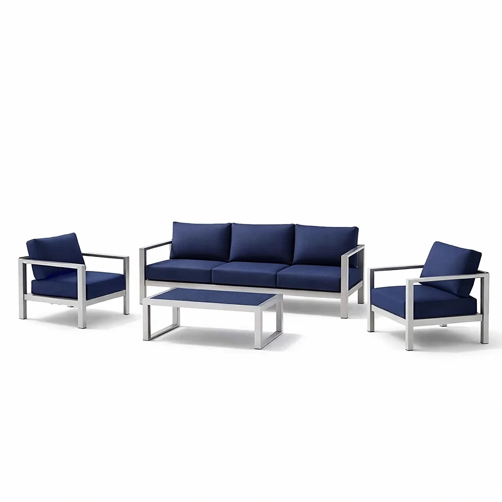 Set di divani in alluminio con cuscini in tessuto blu