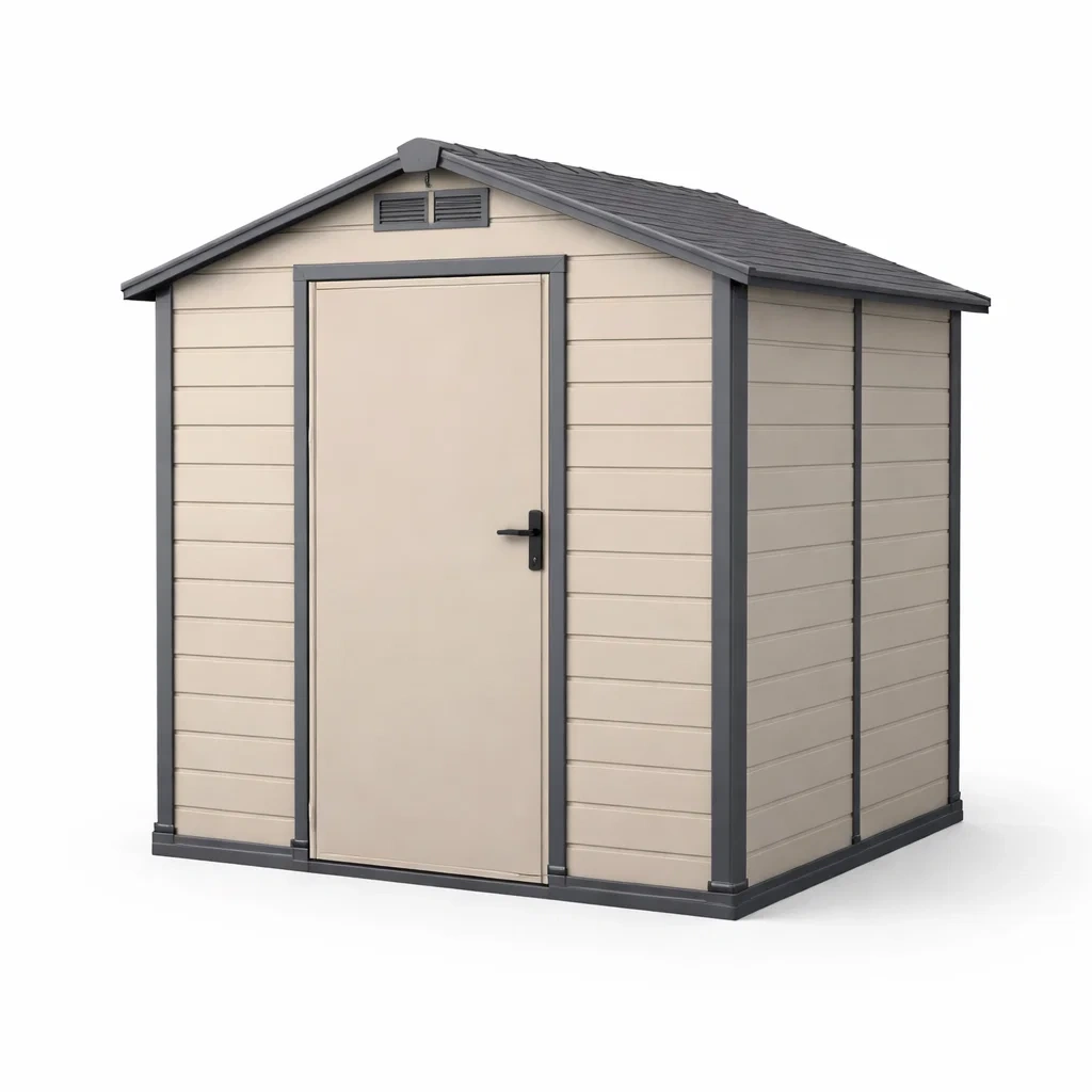Questo capanno è realizzato in resina durevole, con dimensioni di 185 cm di lunghezza, 152 cm di larghezza e 226 cm di altezza. Ha una porta battente dotata di maniglia e serratura. Sopra la porta, le finestre di ventilazione garantiscono una buona circolazione dell'aria. Le pareti hanno uno spessore di 1.2 cm e il tetto di 1.5 cm. Il capanno è impermeabile e trattato per resistere alla ruggine.