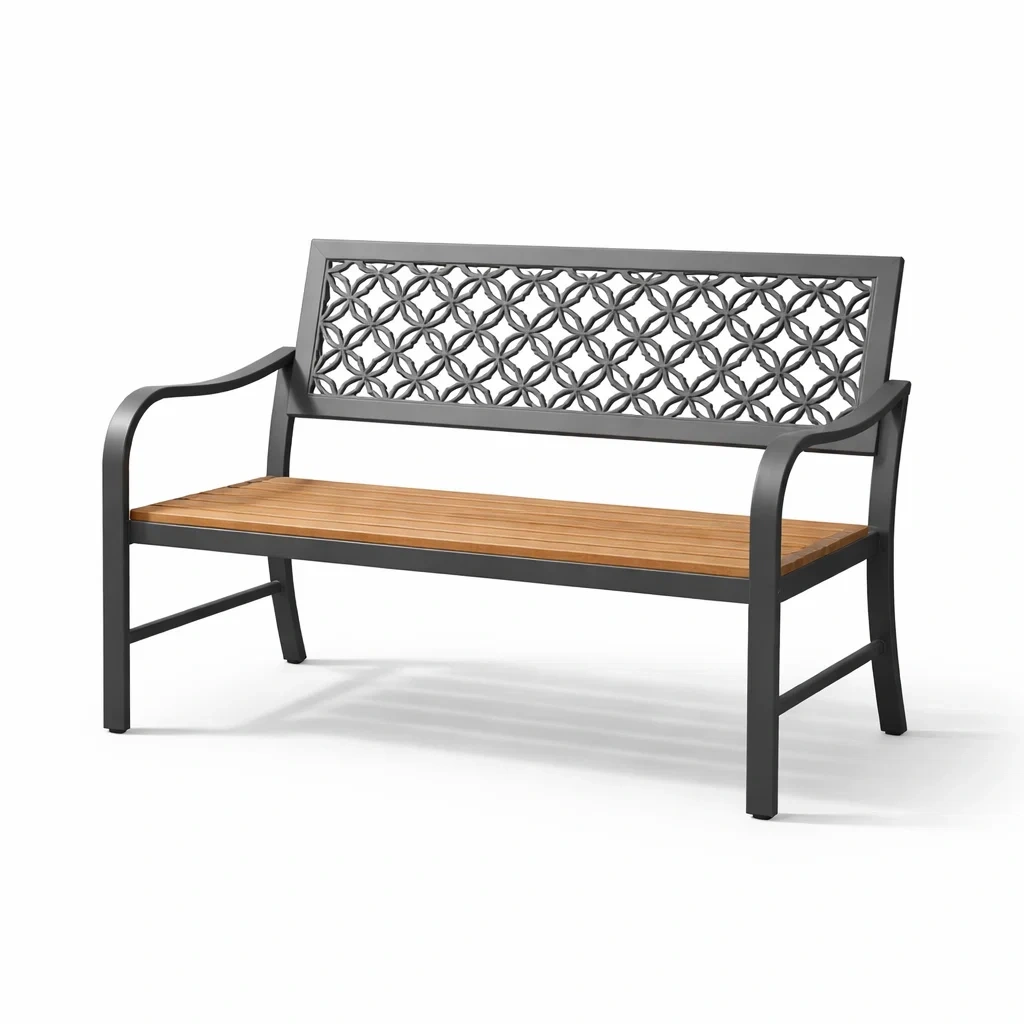 Panchina in metallo e legno con schienale decorato