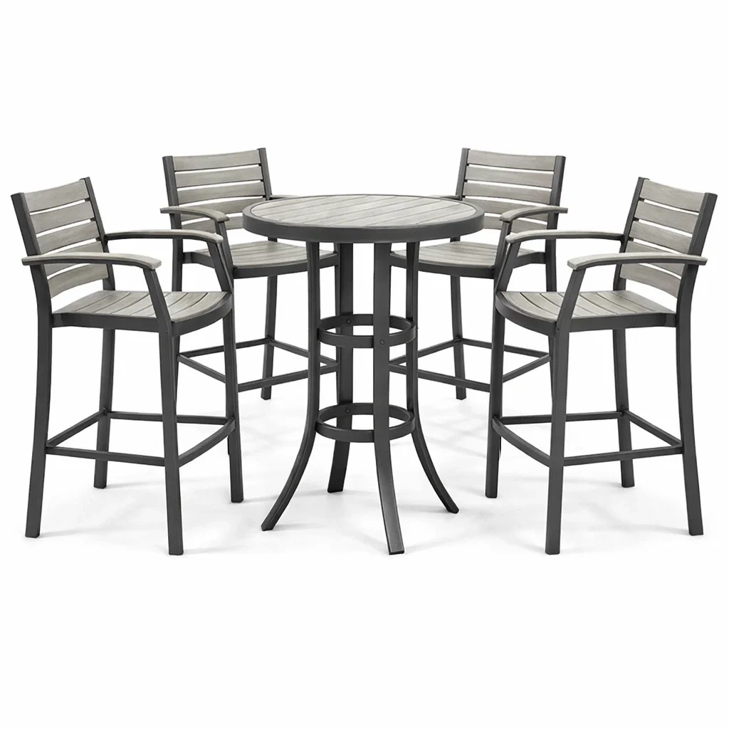 Materiale: Struttura in alluminio, piano del tavolo e seduta delle sedie in legno polistirolo
