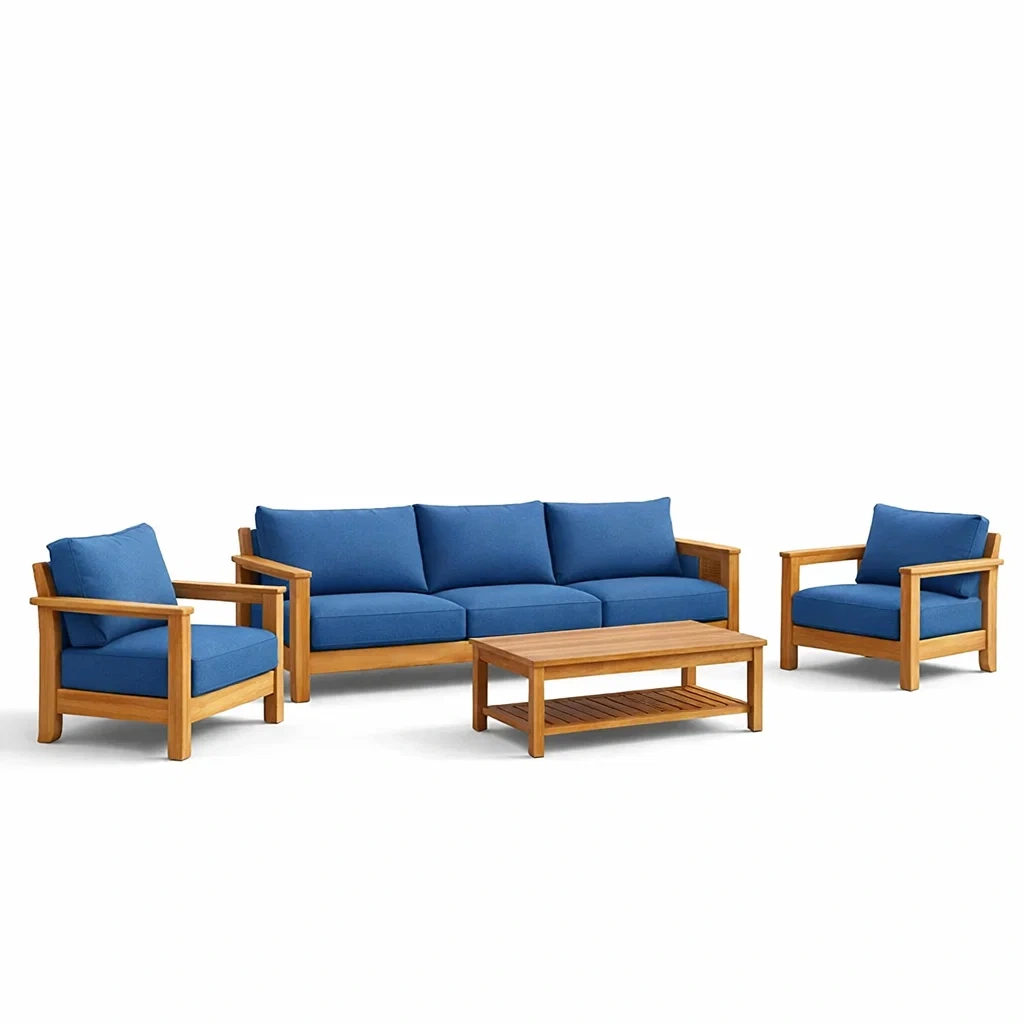 I telai sono realizzati in legno di teak, mentre i cuscini sono in tessuto di poliestere sfoderabile e lavabile con imbottitura in schiuma ad alta densità.
